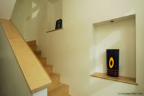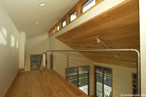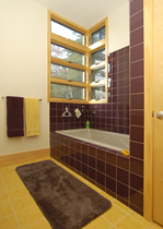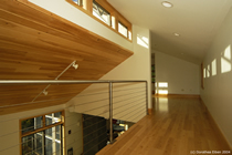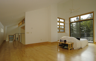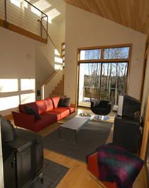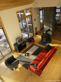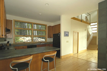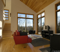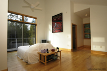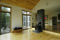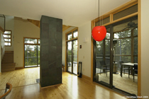 blur the boundaries between the two. Large glass doors give views to distant mountains with dramatic sunsets, and open onto expansive decks, suspended on the steep hillside and looking into the forest canopy. |